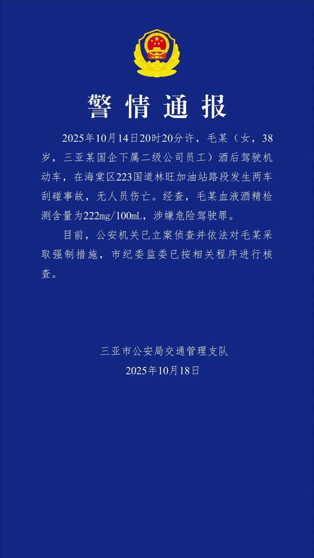 10月18日,三亚市公安局交通处治支队通报:2025年10月14日20时20分许,毛某(女,38岁开云体育(中国)官方网站,三亚某国企下属二级公司职工)酒后驾驶天真车,在海棠区223国说念林旺加油站路段发生两车刮碰事故,无东说念主员伤一火。经查,毛某血液乙醇检测含量为222mg/100mL,涉嫌危境驾驶罪。当今,公安机关已立案捕快并照章对毛某接受强制设施,市纪委监委已按关连关键进行核查